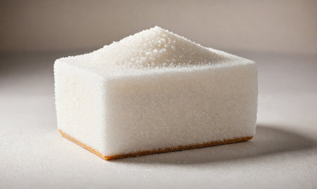 Macro captures a still life of white sugar cubes on marble. Focuses on the crystalline structure and texture detail, creating a visual on nutrition.