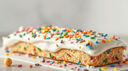 Delicious dessert featuring a long, creamy cake topped with colorful sprinkles on a white background in a bright kitchen