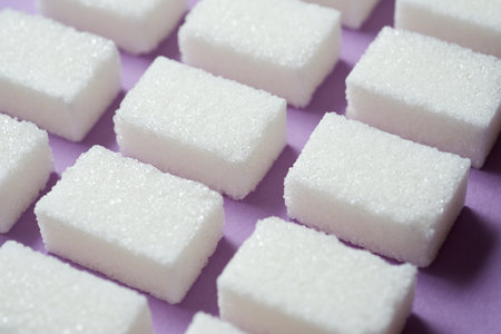 Refined sugar cubes are lined up in a row on a white surface, creating a long shadow, symbolizing the potential negative health effects of excessive sugar consumption