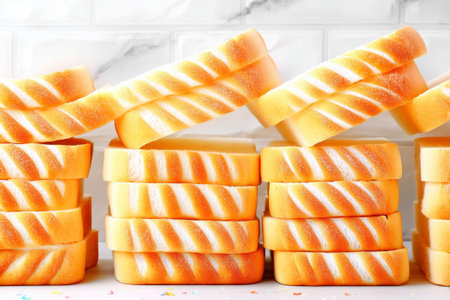 Minimalist style captures neatly stacked white sandwich bread slices on bright background. Clean setting highlights culinary simplicity. Concept of bakeries, cafes, food photography.