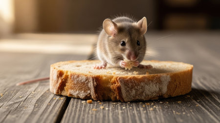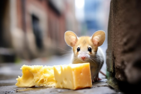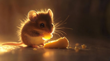 A delightful tiny mouse enjoys a piece of cheese, showcasing its playful expression. The warm lighting and crumbs create a cozy atmosphere filled with charm.