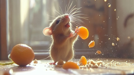 A delightful brown mouse joyfully holds a slice of orange amidst crumbs, enjoying a sunny indoor space, showcasing the charm of small creatures.