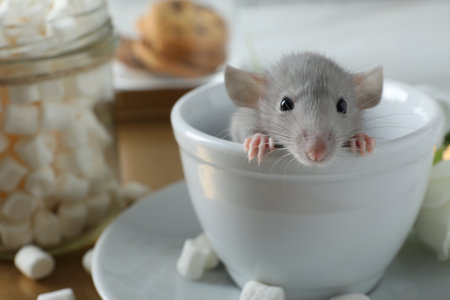 Adorable little rat peeking out of cup on violet background, closeup. Space for text