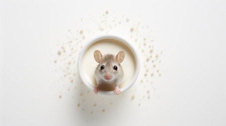 a mouse in a cup, captured in the style of beeple, is seen licking milk on a white surface. this national geographic photo by yukimasa ida showcases a natural phenomenon. the beige-colored mouse with shiny eyes creates a captivating contrast between animals and people. ai generated