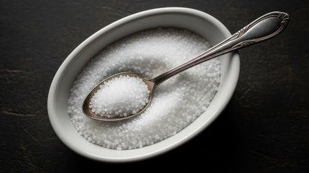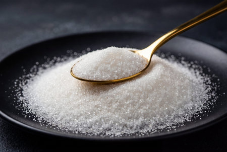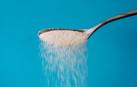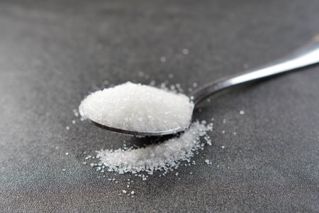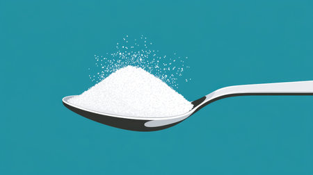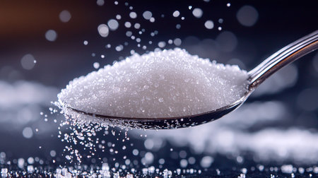 Hand pouring sugar from a spoon, with sugar crystals falling, symbolizing the concept of sugar reduction, no added sugar, and a low sugar lifestyle for better health
