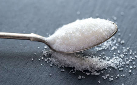 Granulated white cane sugar in a spoon. Cane sugar over metallic background.