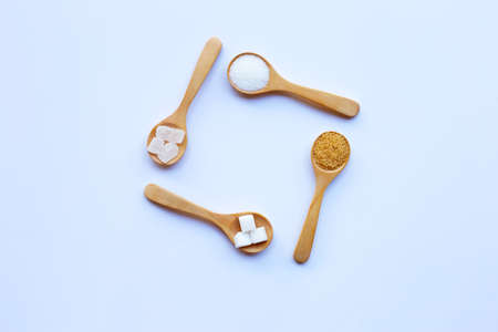 Various types of sugar on white background.