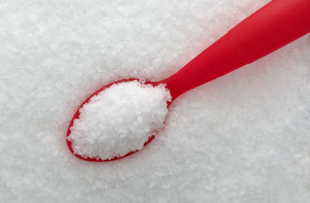 Coarse granules of margarita salt with a red plastic spoon.
