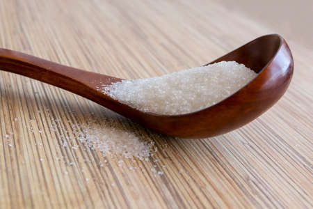 White sugar in wooden spoon on a wooden background.