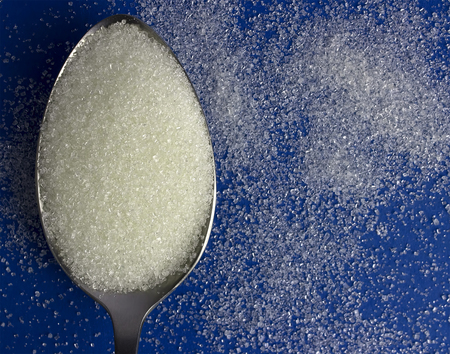 Close-up of a spoon with sugar heap, crystals of white sugar on blue background, top view