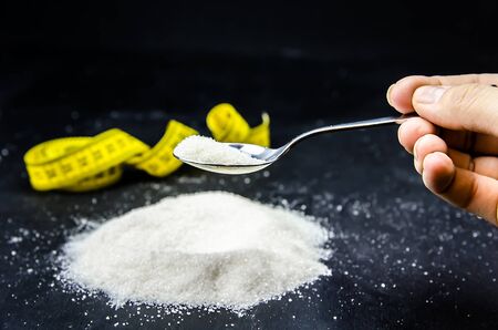 Minimalist flat lay composition sugar and spoon on the dark background. Medical, Healthcare and Diabetes Concept. Top view and selective focus.