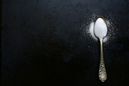 white sugar scattered on a metal spoon on a black table