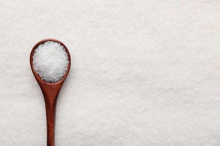 Top view of spoon with sugar on white background with copy space