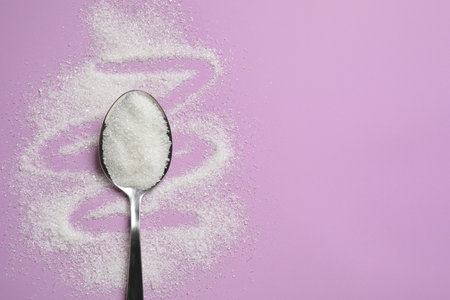 Granulated sugar and spoon on lilac background, flat lay. Space for text