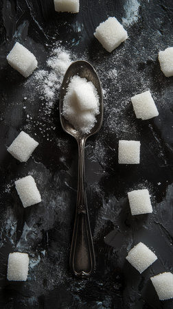 White sugar cubes arranged around an antique spoon filled with granulated sugar, creating a contrasting image against a dark, textured backdrop, symbolizing sweetness, baking, and unhealthy food