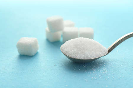 Falling sugar from spoon on turquoise background, symbolizing sugar reduction and health risks