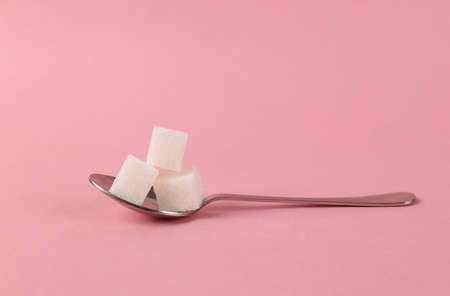 Spoon with sugar cubes on pink background