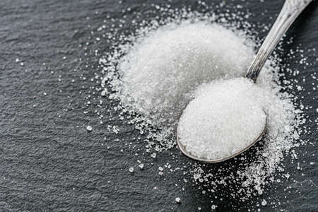 Teaspoon with sugar on a black plate. Small spoon with granulated sugar close-up. Diabetes concept.