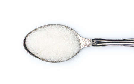 White sugar on spoon over white background