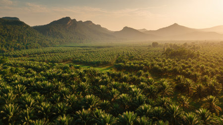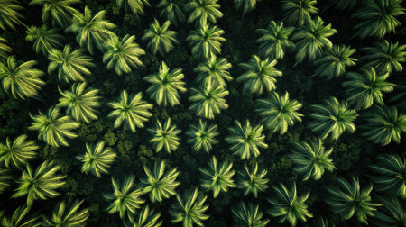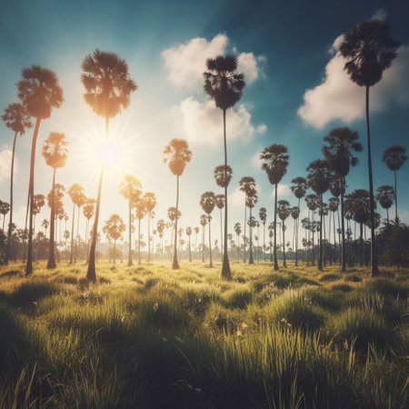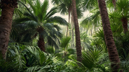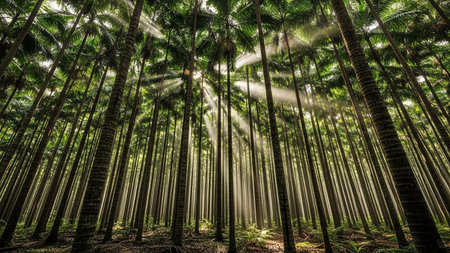 Experience the enchanting beauty of a tropical palm tree forest illuminated by soft sunlight. This lush landscape showcases vibrant greenery, inviting tranquility and peace.