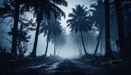 A serene landscape features tall palm trees in the foreground with rolling mountains in the background. Mist envelops the peaks creating a mystical atmosphere during early morning hours.