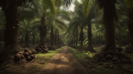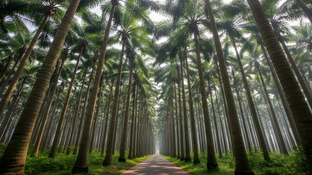 Path through a dense plantation of palm trees, showcasing vibrant greenery and a natural ambiance. Lush vegetation and healthy growth are evident in the image, suggesting a thriving agricultural setting.