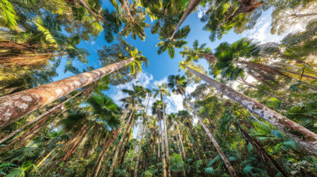 Gaze up at majestic palm trees in a tropical setting capturing nature's beauty from a unique perspective.