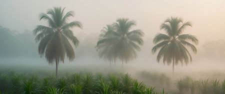 Coconut plantation in early morning mist with soft sunlight filtering through the trees