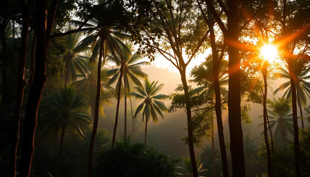 Lush green tropical rainforest bathed in morning sunlight, sunbeams filtering through dense canopy of trees and palm trees. Tranquil and serene atmosphere.