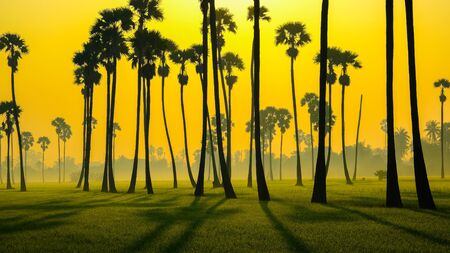 Rice plantation field morning sunrise with sugar palm tree agricultural industry