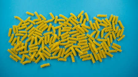 Fusilli spiral paste on a blue background, top view, food background, durum wheat dough, proper nutrition concept,