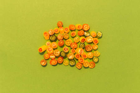 Assortment of colorful sweet handmade candy pieces arranged on green paper