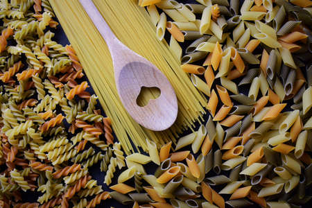 Wooden spoon on spaghetti pasta, with two other varieties of colored pasta, spirals and macaroni
