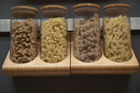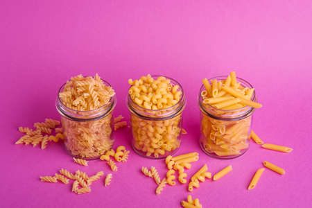 Three glass jars with variety of uncooked golden wheat pasta on minimal pink background, angle view