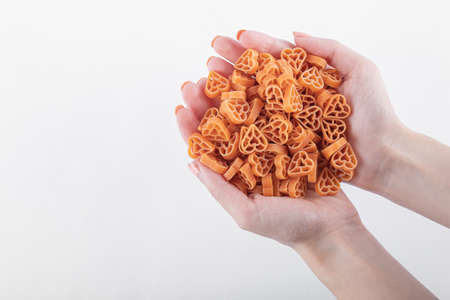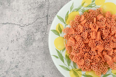 Pasta not cooked on a white plate with a red heart on a dark background with copy space. Pasta love concept.