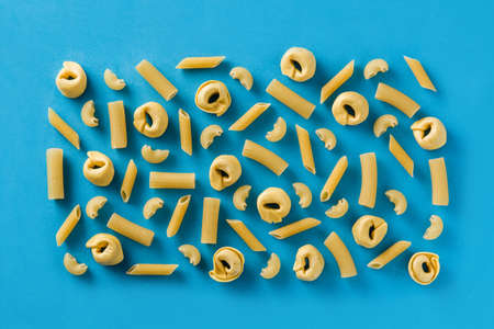 Different types of pasta pattern. Penne pasta and tortellini on blue background