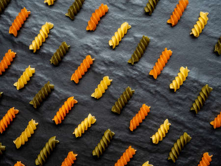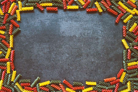 Red green and yellow dry raw fusilli pasta. Colorful pasta background with copy space.