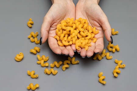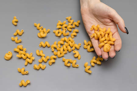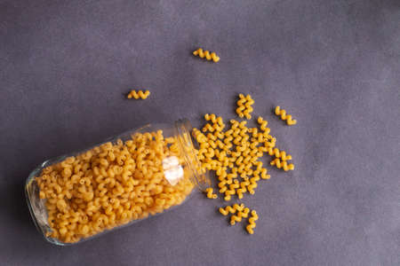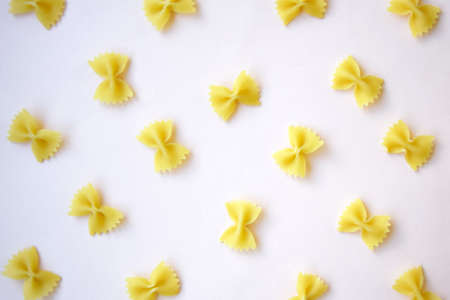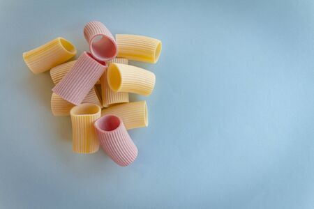 Uncooked pasta on neutral background. Meal based on flour. Italian healthy food.