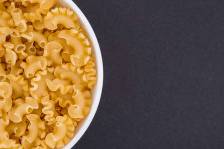 White glass bowl of raw pasta. Isolated on a dark gray background. Top view close up