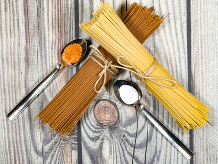 Raw spaghetti and pasta with seasonings and spices on a wooden background. food flatley.