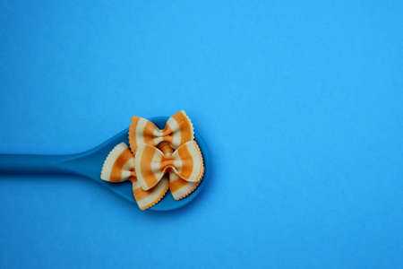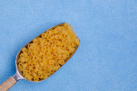 Dry pasta in a metal scoop on a blue background. Selective focus.