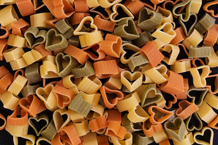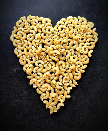 Penny pasta forming a heart-shape isolated on black texture wooden background, valentine day love formed heart.