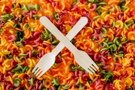 Multicolored pasta with a wooden forks as a background image. Top view. Copy, empty space for text.