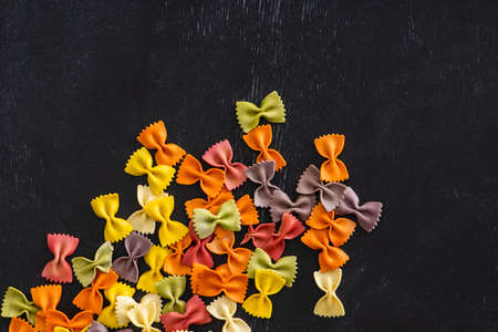 Raw pasta spaghetti and farfalle in shape of frame on dark background.