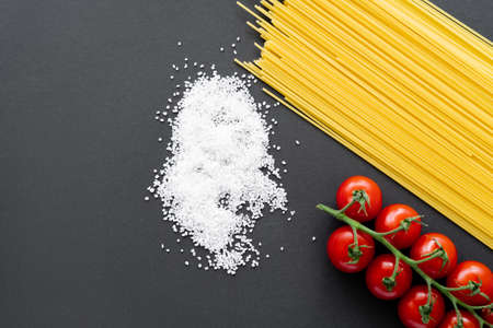 Top view of salt near raw pasta and cherry tomatoes on black background