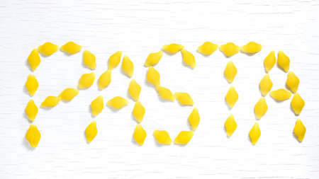 The word Pasta is laid out of raw pasta on a white background. The view from the top.