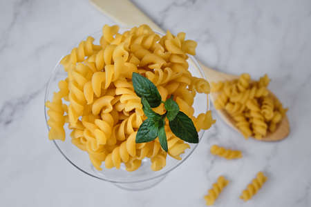 Raw uncooked italian pasta on cocktail glass over white marble. Fusilli. Diet and food concept. Top view.