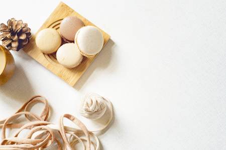 Top view of a cookie with latte and spruce cone and a yarn. Four cookie cakes, coffee and spruce cone and a tangle on the white table. Spring day. Flat lay with copy space for text.