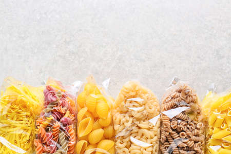 Various mix of pasta flat lay on colored paper. Diet and food concept.