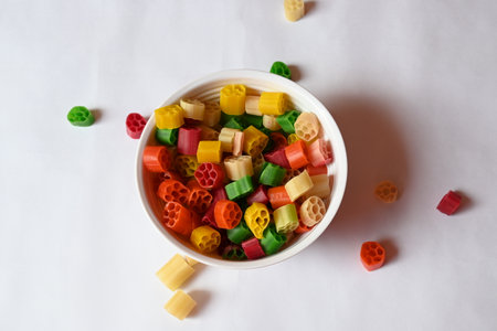 Multicolored pasta in a disposable kraft paper cup scattered on a white background. Top view. Copy, empty space for text.